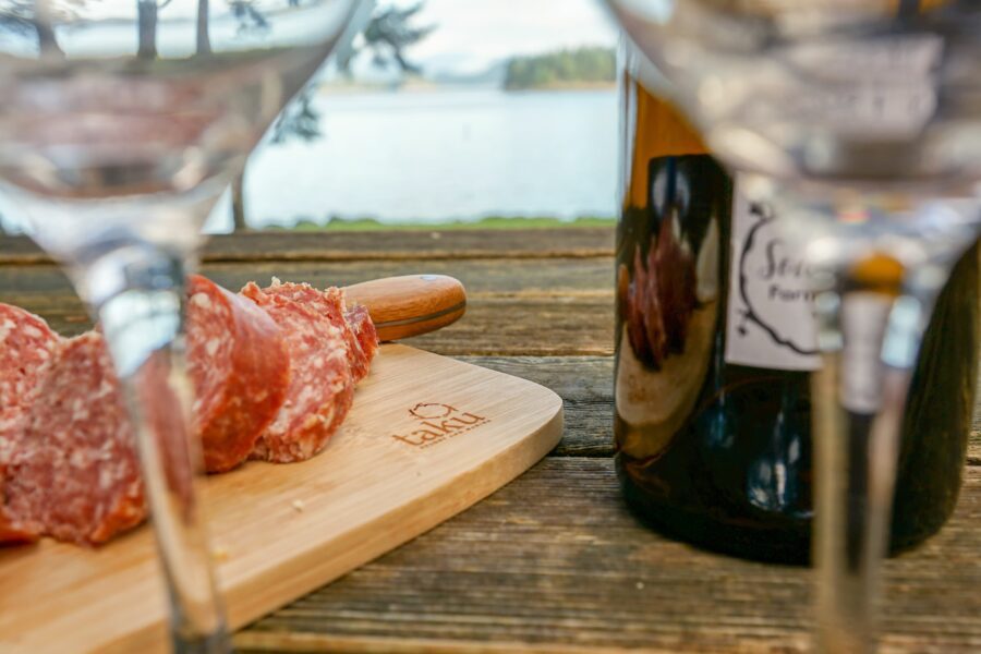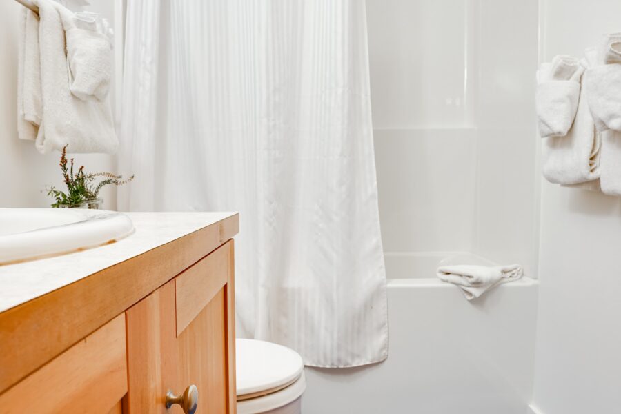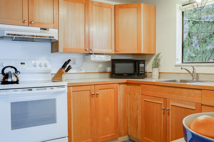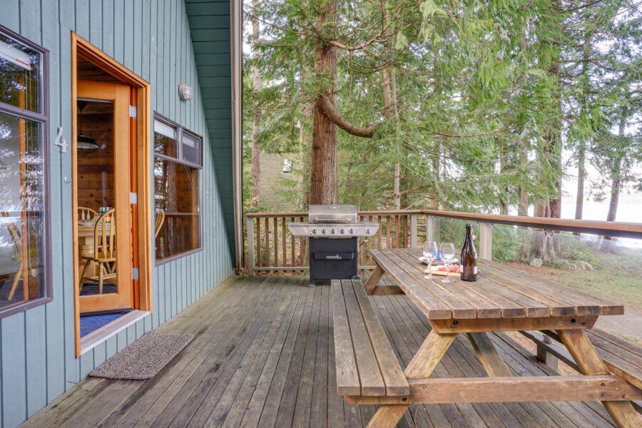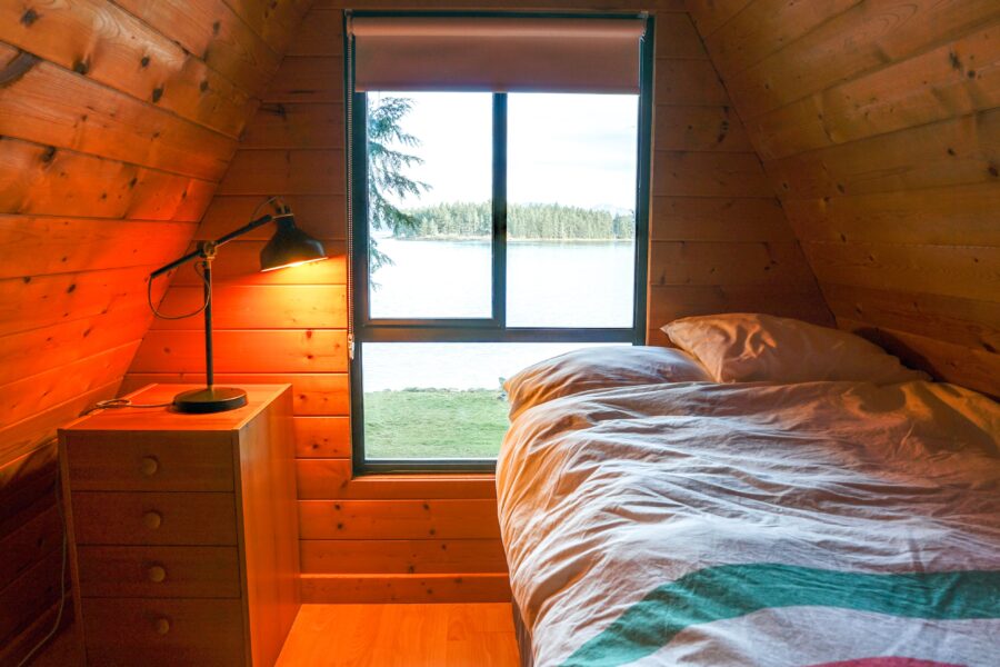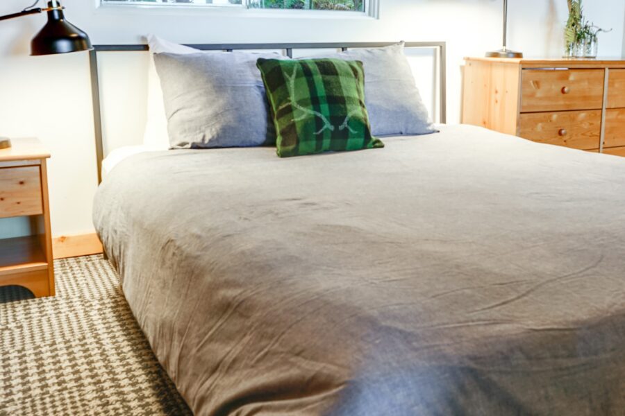 In a fully open concept, the main floors feature gas fireplace, a full kitchen, queen bed and a queen sofa bed. It’s easy to relax and disconnect since these suites don’t have a TV. Up the ladder in the loft, you’ll find three beds. These cabins can sleep up to seven people and are pet friendly.