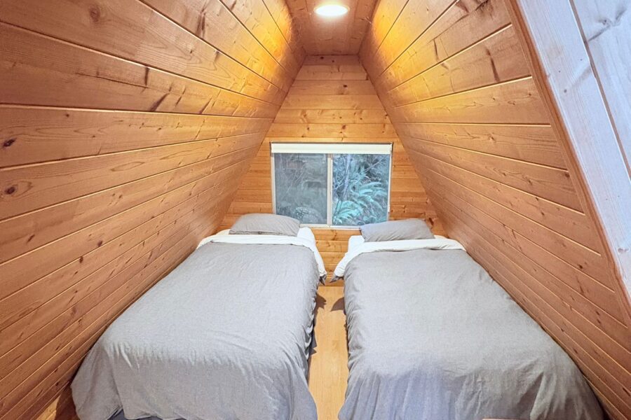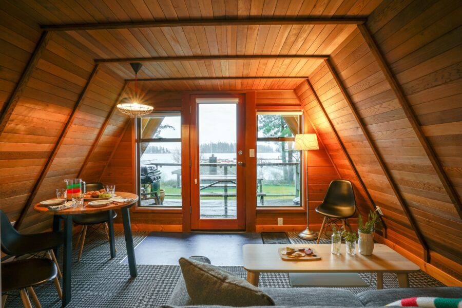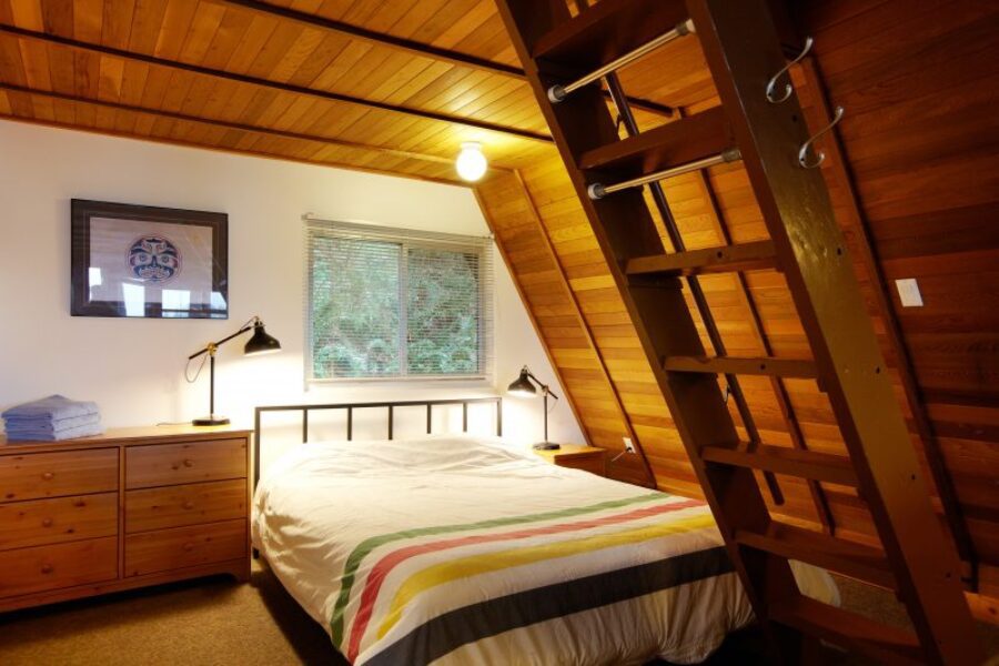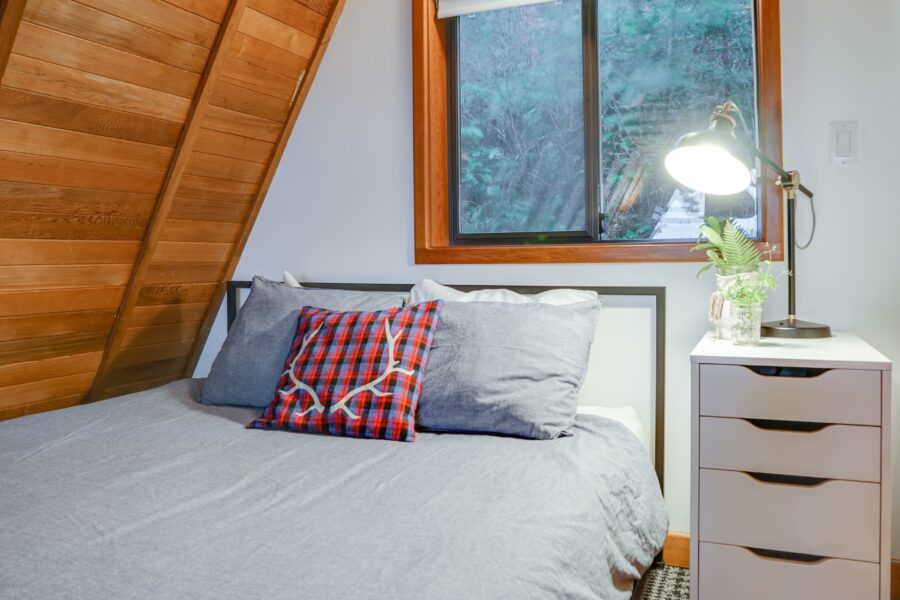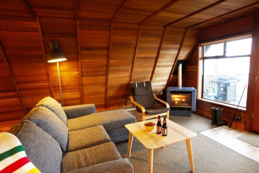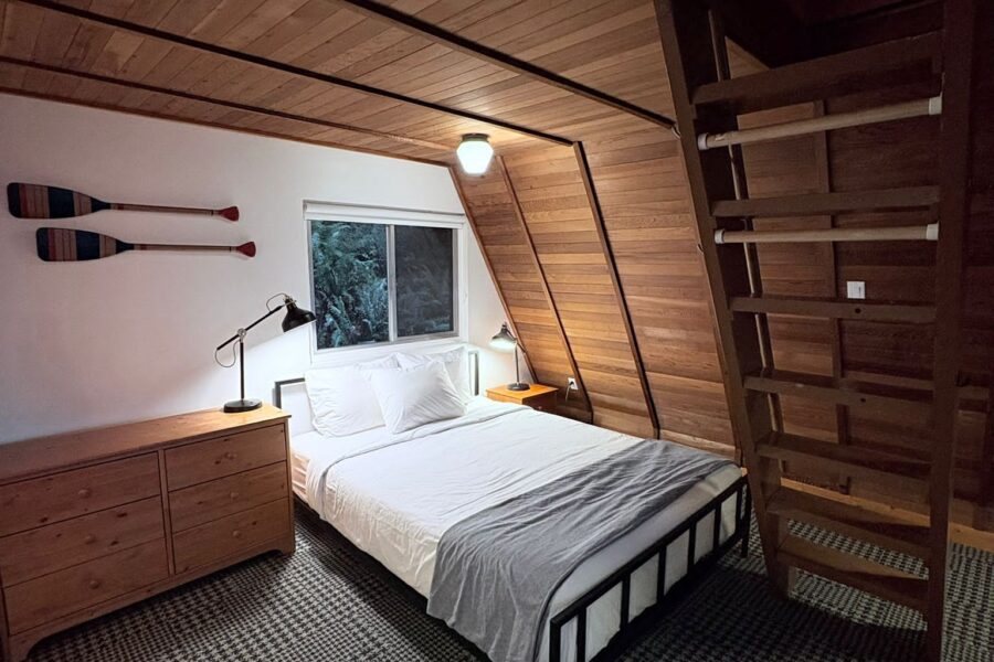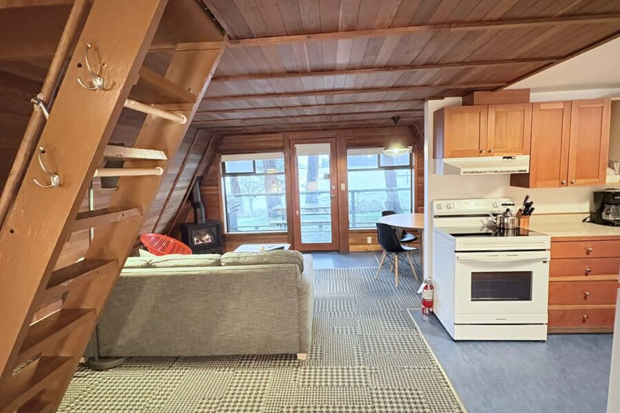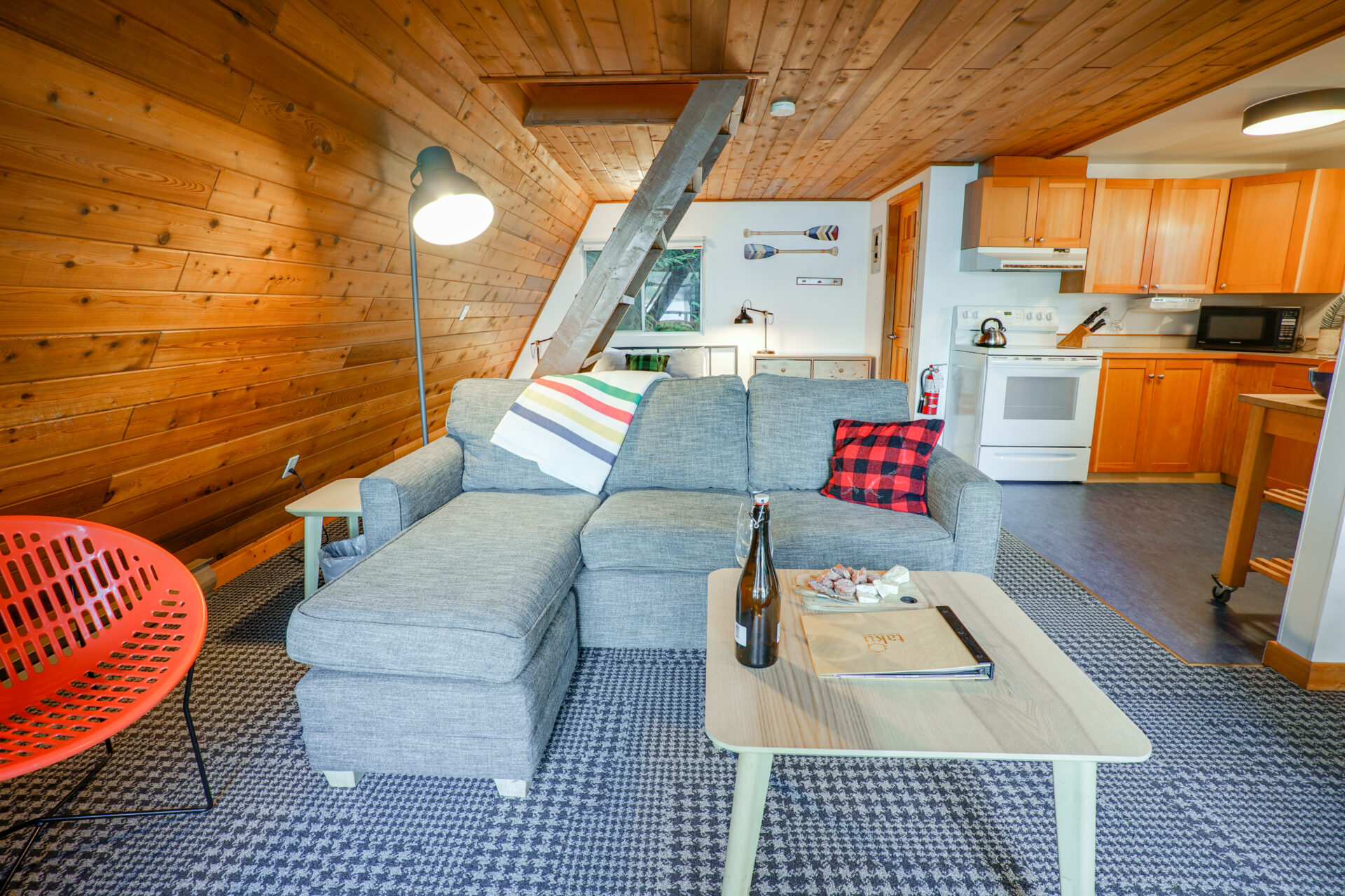 In a fully open concept, the main floors feature gas fireplace, a full kitchen, queen bed and a queen sofa bed. It’s easy to relax and disconnect since these suites don’t have a TV. Up the ladder in the loft, you’ll find three beds. These cabins can sleep up to seven people and are pet friendly.
