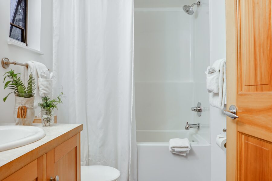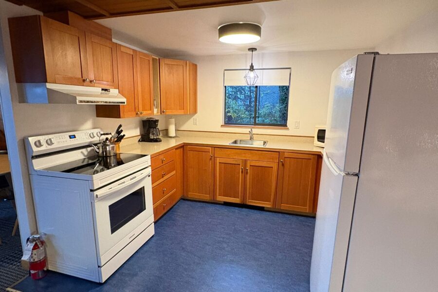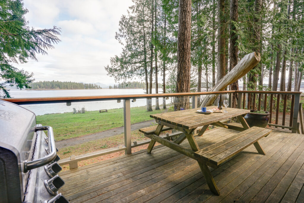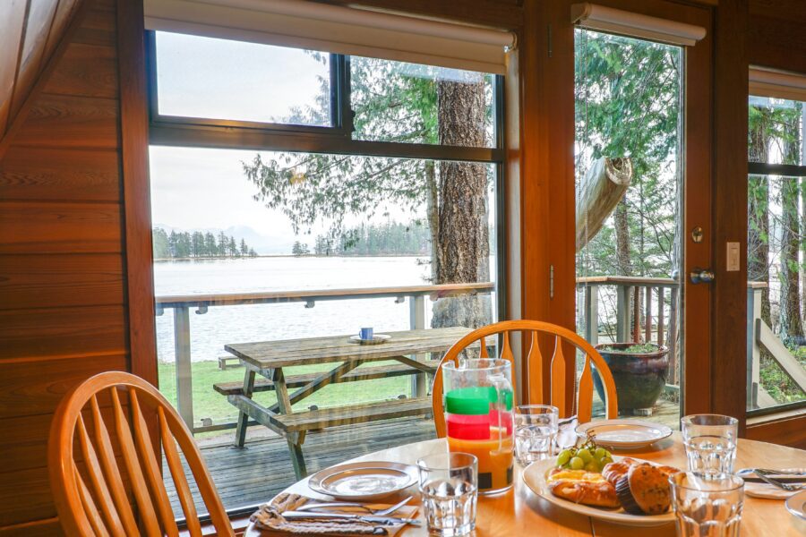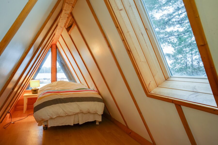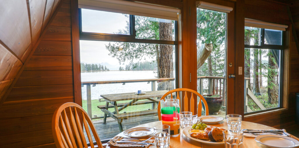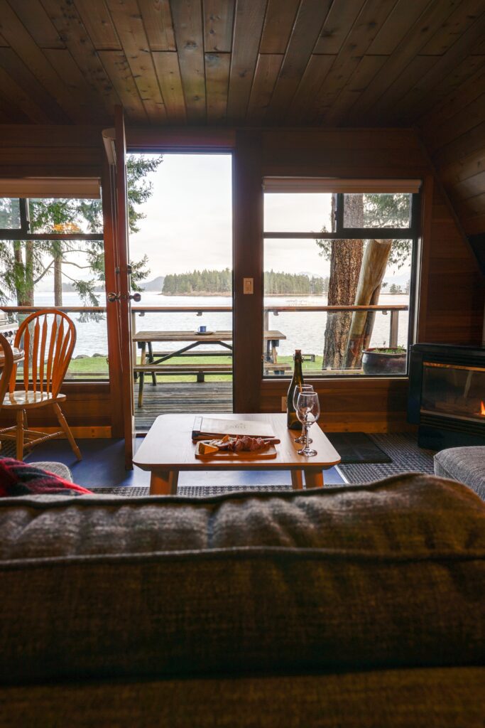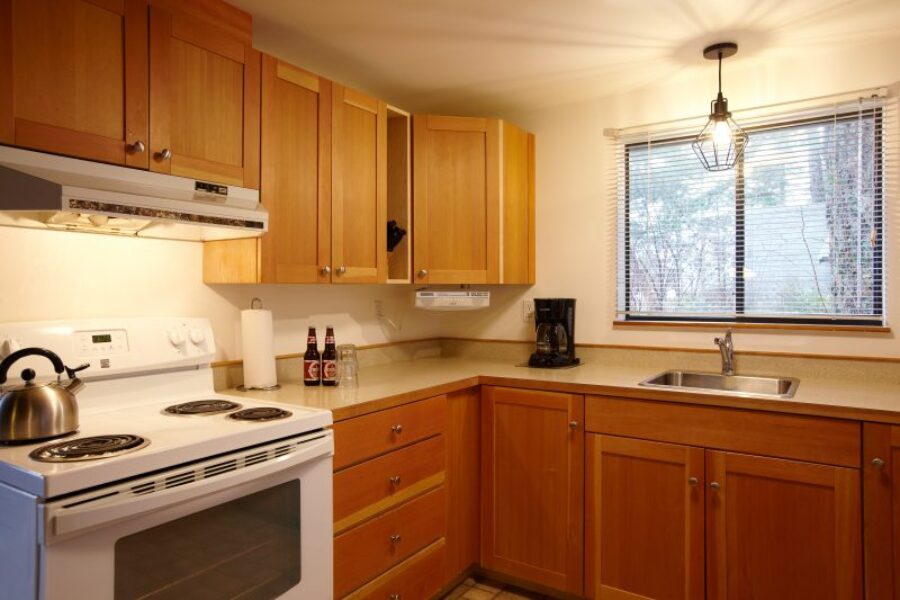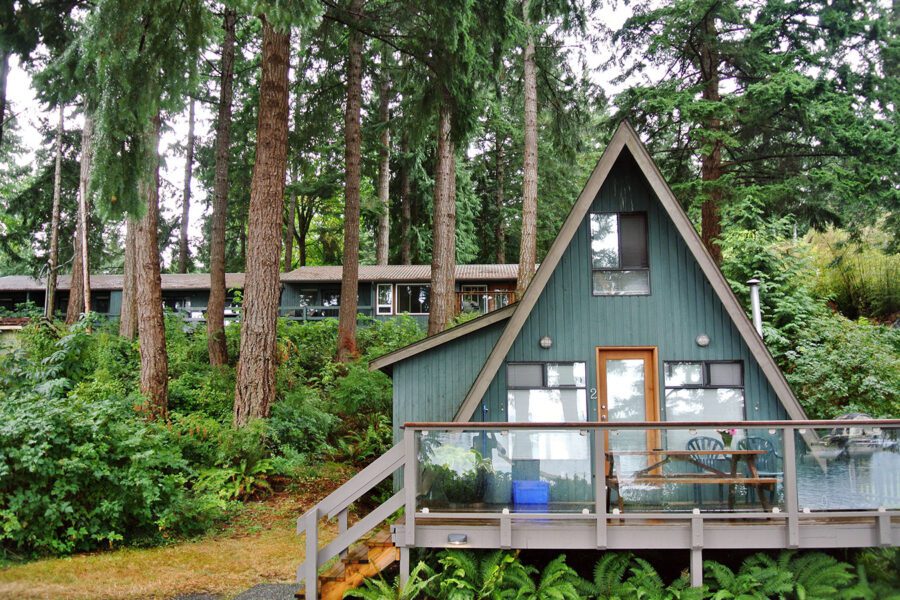 In a fully open concept, the main floors feature gas fireplace, a full kitchen, queen bed and a queen sofa bed. It’s easy to relax and disconnect since these suites don’t have a TV. Up the ladder in the loft, you’ll find three beds. These cabins can sleep up to seven people and are pet friendly.