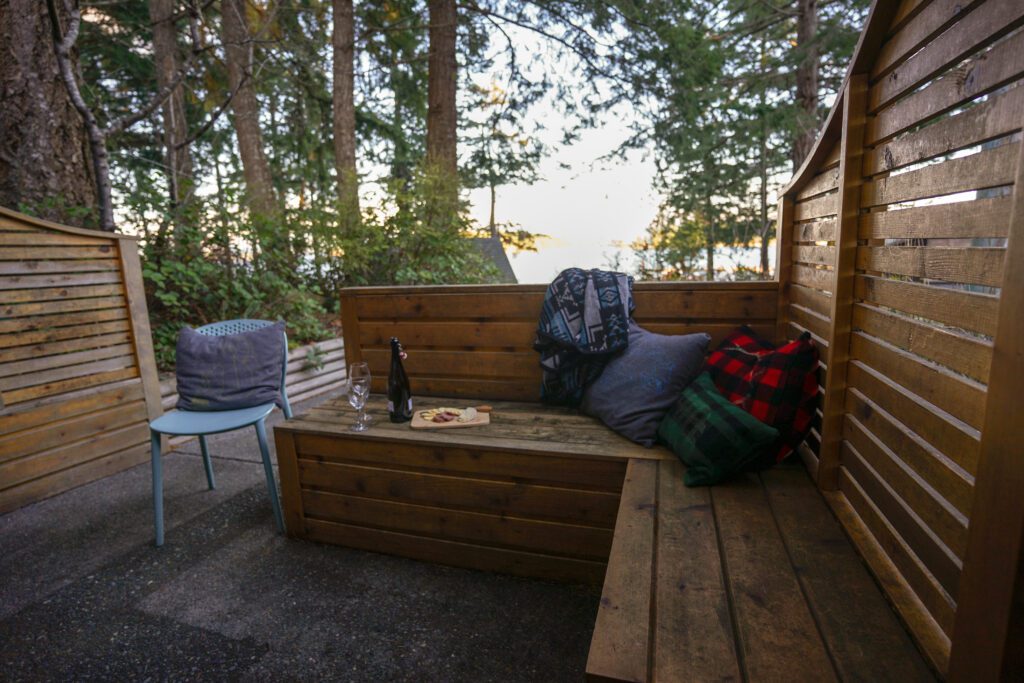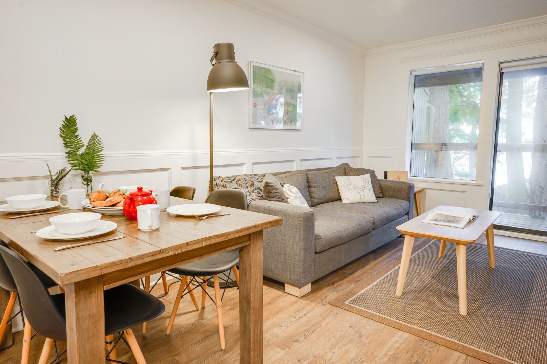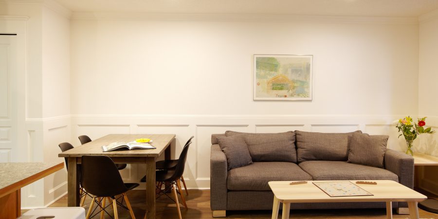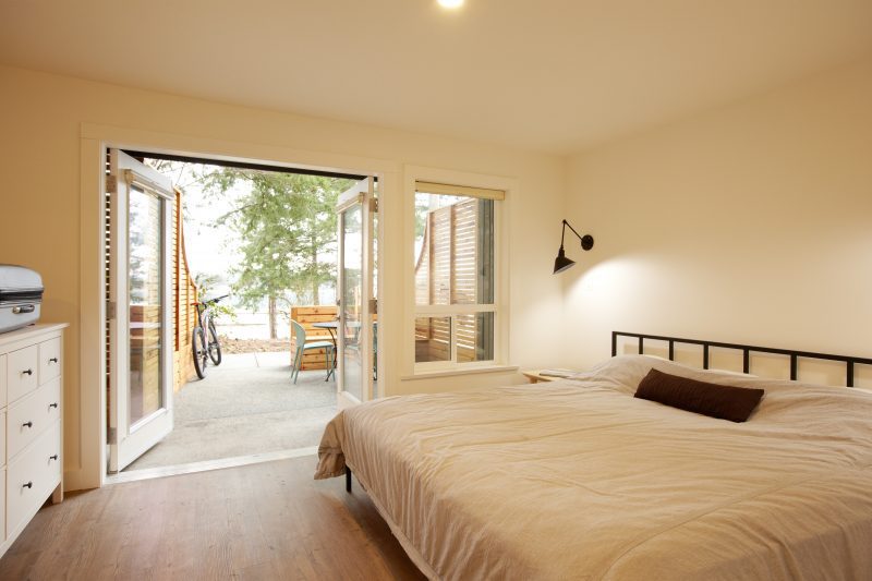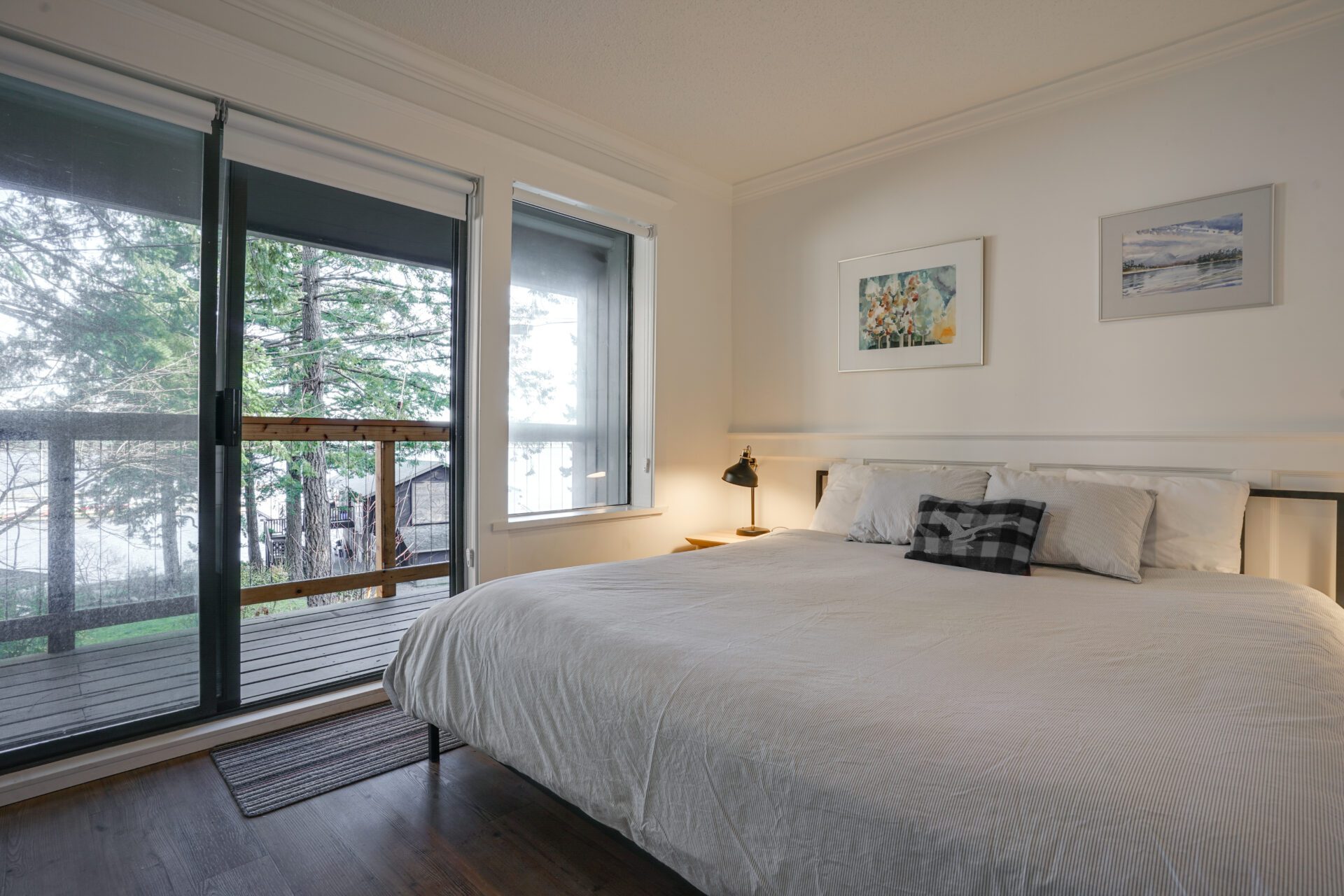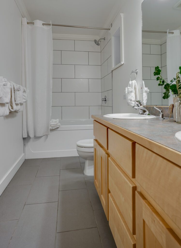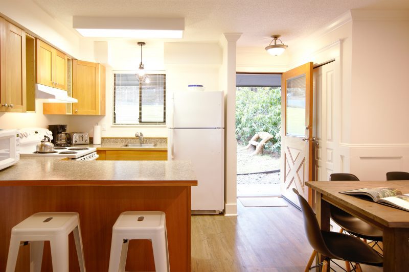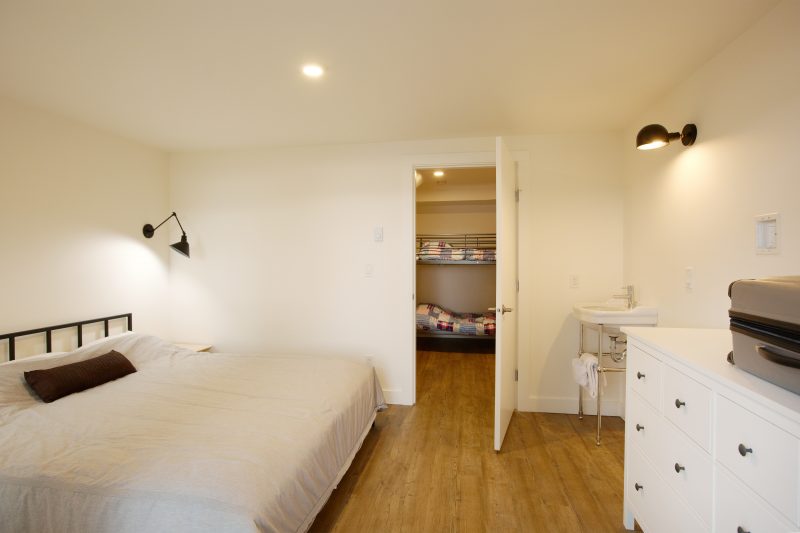 Looking for a suite to sleep a large group of people? Our three bedroom suite has two levels. The kitchen, living areas, large bathroom and Master bedroom with king bed are all on the main level. If you take the stairs down you’ll enter a bunk room and entrance to the third bedroom that has it’s own sink and french doors out to the large sunny patio.